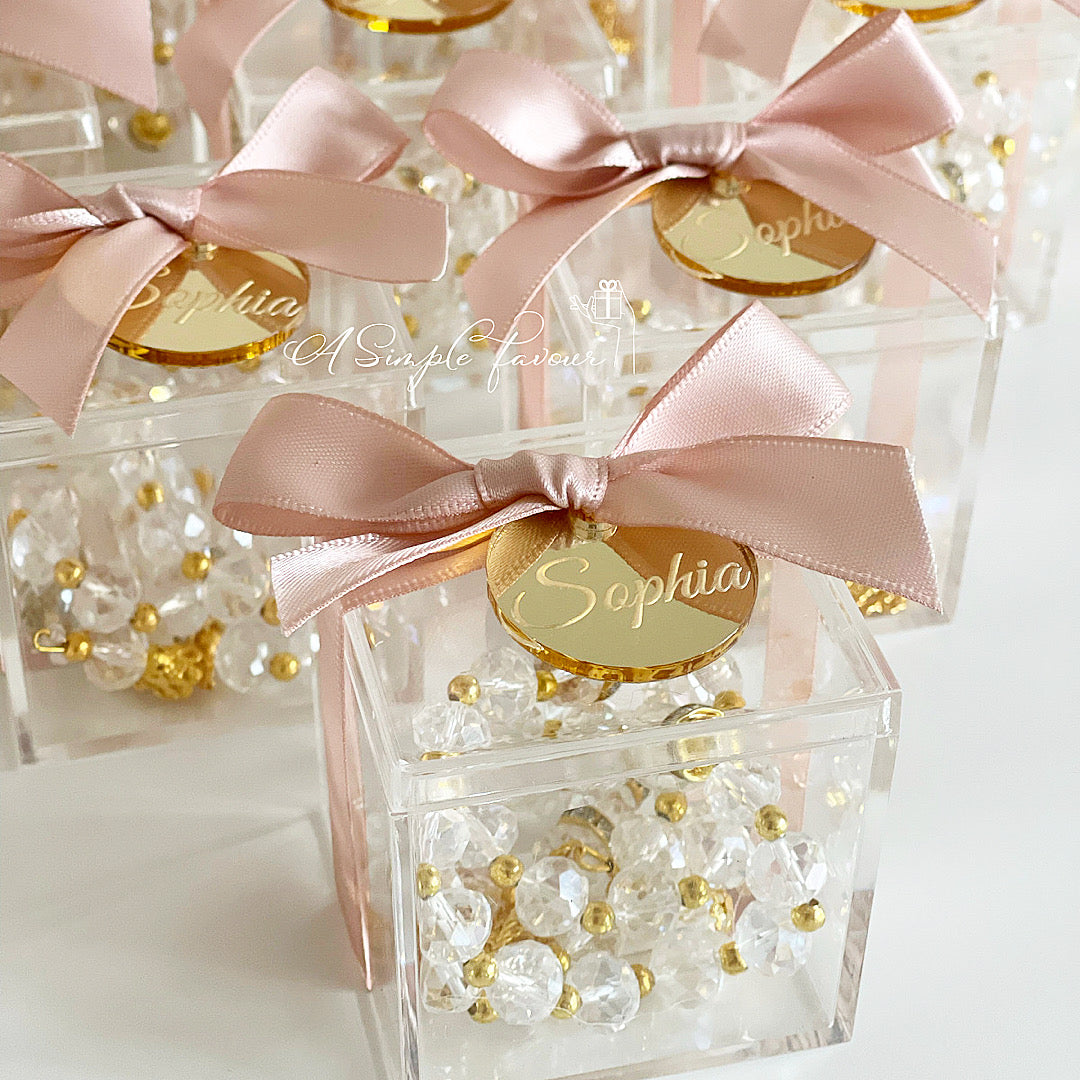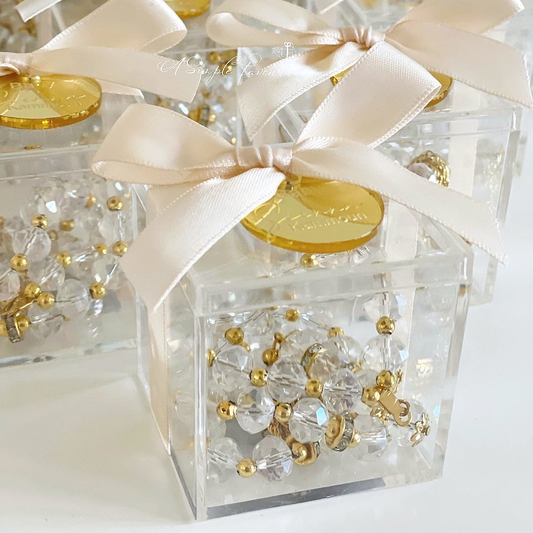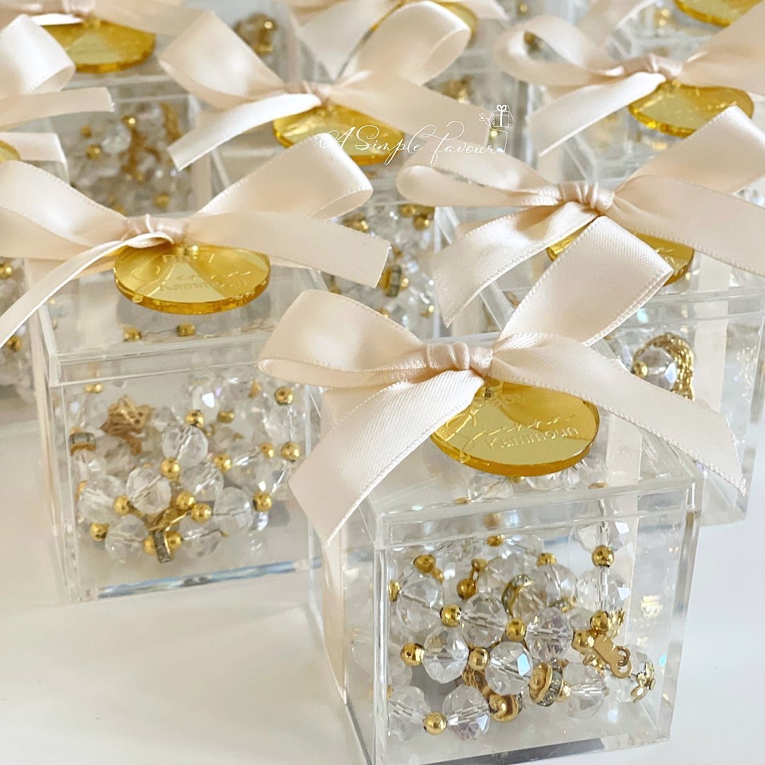 5.5cm Acrylic Box with Crystal Masbaha finished with ribbon colour of your choice and personalised Acrylic tag.