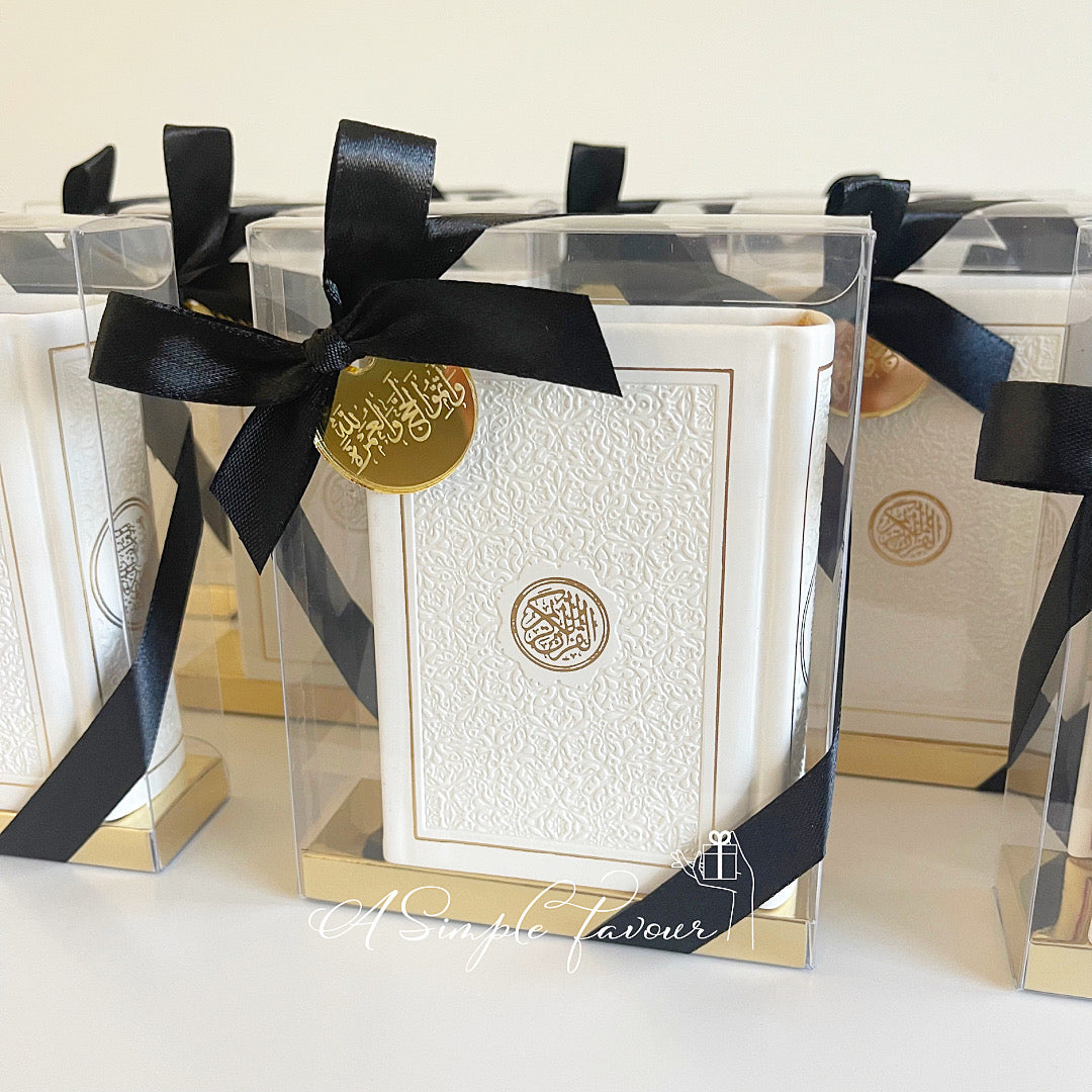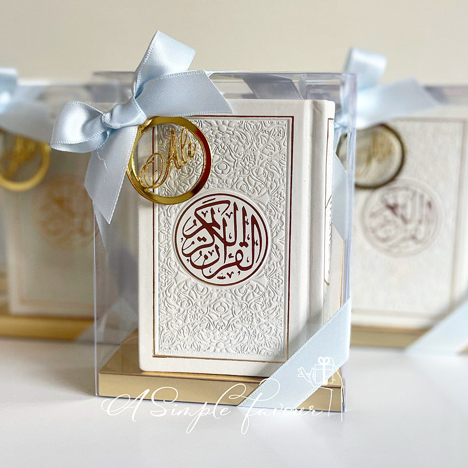 10x7cm White Faux Leather Quran with gold detail & rainbow pages packaged in a 13cm PVC box finished with a Acrylic 3cm Personalised Tag and ribbon colour of your choice
